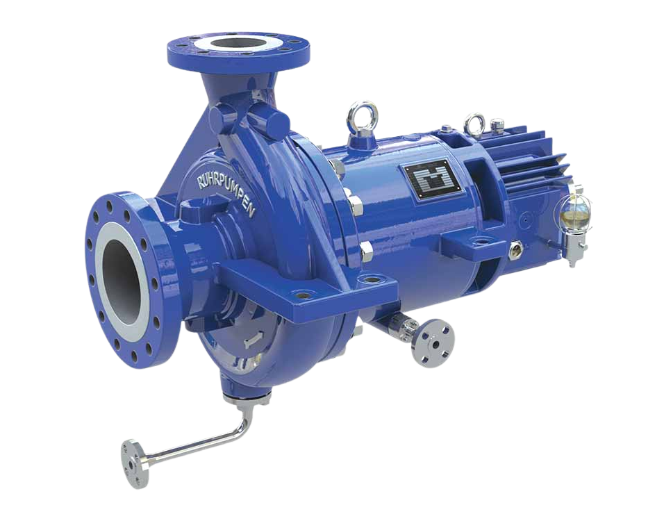 Gebouwd op de hydraulica van de SCE-procespomp, maar dan sealless: geen mechanische asafdichting en dus geen diffuse emissies en minder onderhoud. Het centerline-mounted, radiaal gesplitste huis is geschikt voor thermische uitzetting; end-top nozzle-configuratie, single-suction waaier met axiale krachtbalans. Standaard ring-oilsmering, vervangbare slijtringen, patent journal bearings in siliciumcarbide (SSiC), inducer mogelijk voor lage NPSHa, plus keramische isolatie/thermische barrière en een zelfontluchter/volledig te draineren containment shell. Typische toepassingen: raffinage, (petro)chemie, gas, energie/utility.